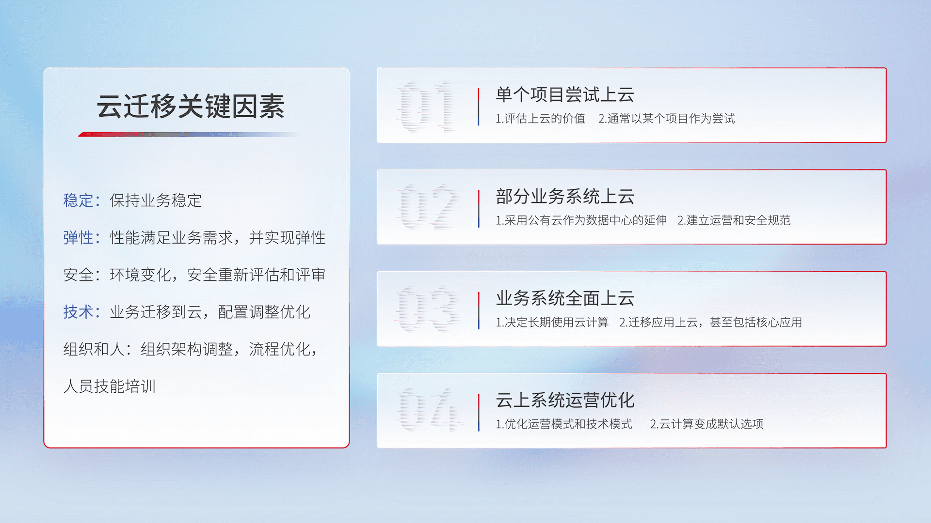 结合实际业务,,从规划设计、、、、云平台选型、、、、云原生改造、、、、数据迁移、、、、集成交付,,迁移全过程为客户识别最佳上云路径,,做好风险识别管理,,设计网络架构、、、身份权限、、安全审计合规、、操作审计、、日志审计、、、监控告警策略、、、、多站点容灾设计等,,对云上基础设施进行整体规划,,,提升IT治理水平,,以满足弹性、、高可用、、、高性能的需求。。。