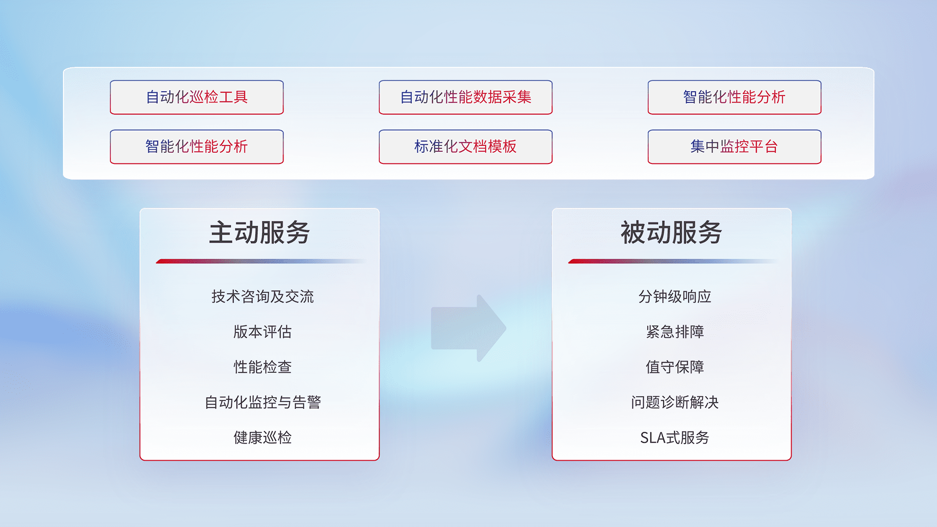 智能化工具和标准化文档,,,保障服务质量,,,提供主动服务(包含技术咨询、、、、版本评估、、性能检查、、、、自动化监控与告警、、、、健康巡检)和被动服务包含(分钟级响应、、、、紧急排障、、、、值守保障、、问题诊断解决、、、、SLA服务)。。。。